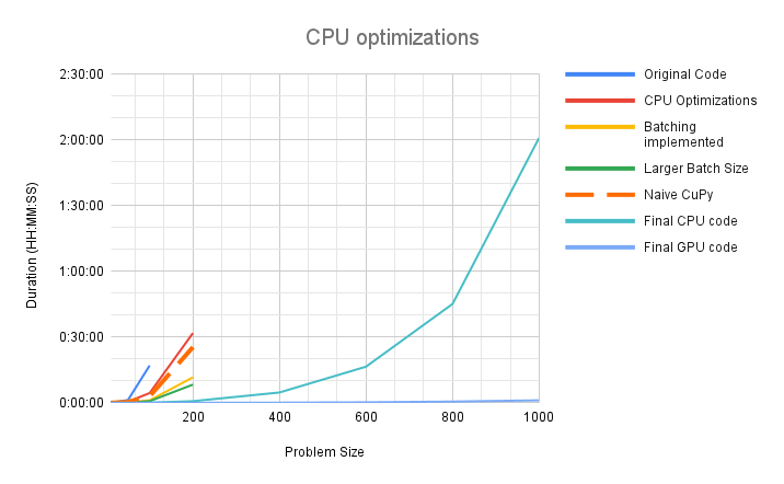 We achieved significant speedup on both CPU and the GPU. In our initial implementation the code would timeout after 4 hours, processing a problem size of N=400. After all optimizations, we are processing a realistic problem size of N=1000 in 2 hours on CPU and just over 1 minute on the GPU. The problem sizes that needed to be partitioned before can now be executed directly and the implementation is expected to scale to larger problem sizes as well.