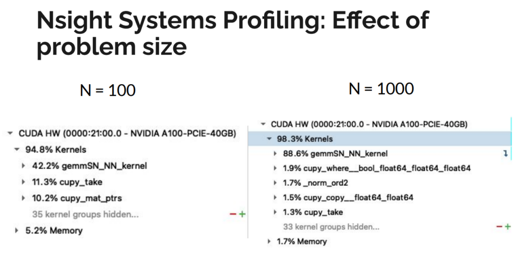 We initially used drop-in replacements of NumPy calls with CuPy. This actually worsened performance compared to a single CPU core, likely because optimizations for CPU do not necessarily translate to GPU speedups. We used NVIDIA’s Nsight Systems to generate a profile of the kernel launches being generated by CuPy and understand the memory transfers from host to device. We noticed that CuPy was generating hundreds of launches of a kernel called “gemmSN_NN_kernel”. Although each call performed a small operation, the launch time overhead was as costly as the operation itself. In aggregate, these launches added up significantly, and–worse–this issue would scale with problem size. Further analysis showed that the large number of kernel launches generated by CuPy was due primarily to two operations.  First, a 4D matrix multiply was decomposed into a series of 3D multiplications, where the last dimensions were small.  Flattening the matrix into 3D greatly reduced the number of kernel launches and increased the size of each operation.  Second, a matrix conjugation was expressed as a direct translation of the underlying mathematical theory as two matrix multiply operations.  Careful inspection of the final result revealed the costly multiplications could be replaced with a single, element-wise multiplication, further reducing the number of kernel launches performed by CuPy.